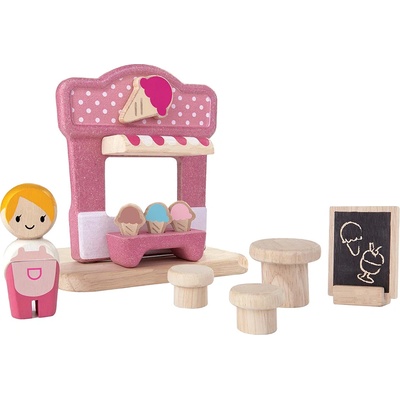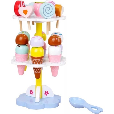 Velká dřevěná pojízdná prodejna zmrzlin. Balení obsahuje dřevěnou prodejnu, dřevěné zmrzliny, dřevěné nanuky, dřevěné kornoutky, dřevěné kleště na nabírání zmrzliny, dřevěnou...