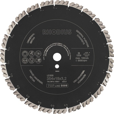 Kotouč určený pro suché i mokré řezání Určeno pro řezání mnoha minerálních materiálů, jako je beton, železobeton, klinker, keramika, přírodní kámen, konglomeráty atd. Upevňovací otvor 32 mm Průměr kotouče 300 mm