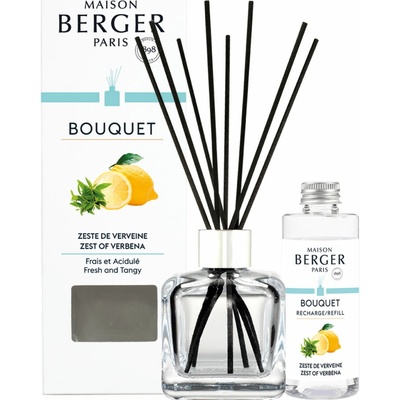 Dárkový set obsahuje elegantní aroma difuzér ve tvaru krychle francouzské značky Maison Berger Paris, 100 ml interiérového parfému s vůní Verbena a 8 kusů polymerových vonných...