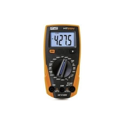 HT25N je kompaktní, digitální multimetr s velkým podsvíceným LCD displejem, pro AC/DC napětí až 600 V a DC proud až 10 A, odpor, test baterií, zkouška průchodnosti a test diod...