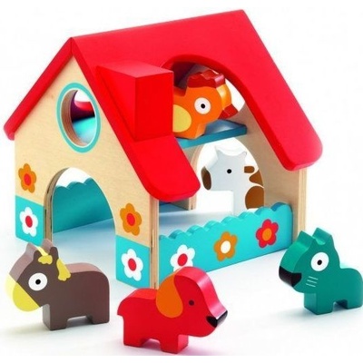 Dřevěný domeček pro zvířátka - Djeco Nádherný dřevěný domeček vhodný pro děti od 2 let. Farmička pro domácí zvířátka. V balení najdete nejen farmičku, ale i pět dřevěných figurek zvířátek - slepička, kravička, kočička, pejsek a koníček. Jednoduchý domeček pro...