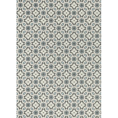 Zátěžové PVC SUPERTEX Eleanor se šedobílou ornamentální dlažbou, doplněnou o jemné geometrické vzory a světle modré detaily, působí elegantně, dekorativně a dodá interiéru...