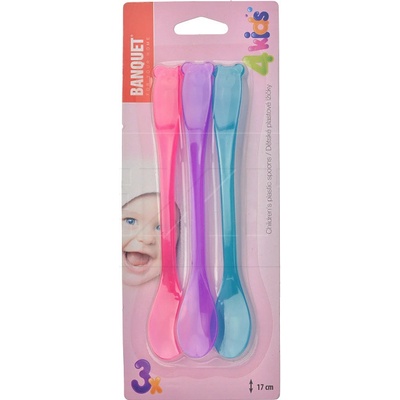 \n\ndětské plastové lžičky dlouhé 3 ks v sadě \ndélka 17 cm \ndodávány v transparentním provedení v mixu barev žlutá, červená, zelená nebo fialová, růžová, modrá \nvhodné do myčky nádobí \nEAN 8591022
