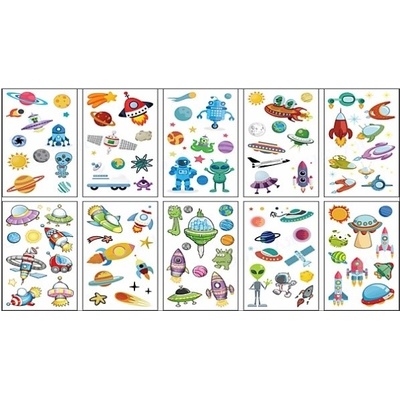 Dočasné tetování - tetovací obtisky ze série Vesmírný svět nabízí 10 různých variant. Tetování odstraníte mýdlem nebo dětským olejíčkem.