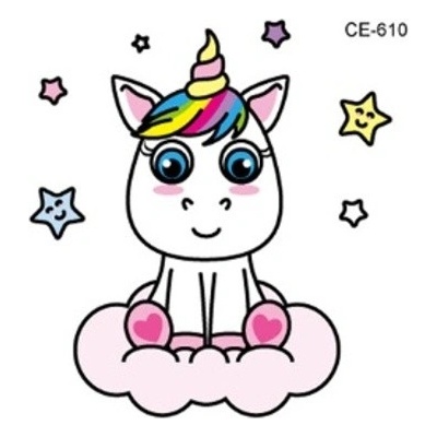 Využijte výhod dočasného tetování a nazdobte si své tělo s tímto krásným jednorožcem na obláčku. Velikost archu s tetováním: 6 x 6 cm.