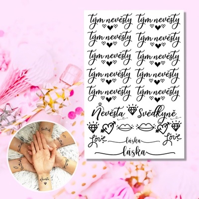 Dočasné tetování na rozlučku se svobodou pro tým nevěsty obsahuje 10 ks TÝM NEVĚSTY, 1 KS NEVĚSTA, 1 KS SVĚDKYNĚ a další motivy. rozměr archu: A6 - 10 x 15 cm návod na...