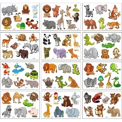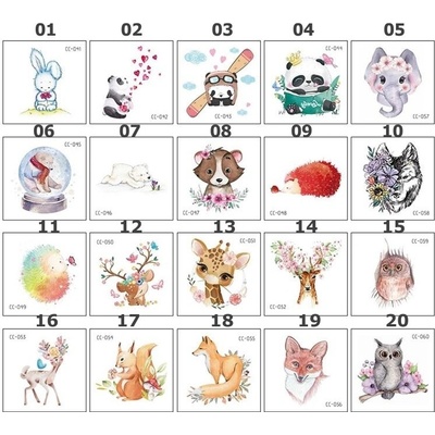 Dočasné tetování - tetovací obtisky ze série Zvířátka nabízí 12 různých variant. Tetování odstraníte mýdlem nebo dětským olejíčkem.