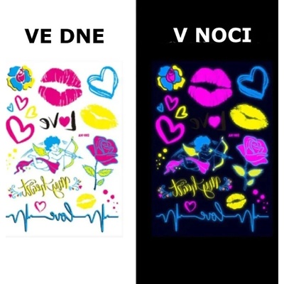 Oblíbené fluorescenční tetovací obtisky Love k nazdobení těla. Rozměry archu 148 x 210 mm. Tetování odstraníte mýdlem či dětským olejíčkem.