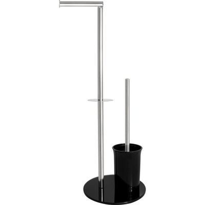 Stojan na toaletní papír se štětkou a místem pro náhradní roli papíru. Má černou základnu a černou nádobku, která mu dodává moderní vzhled.