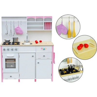 Bílo-růžová dřevěná kuchyně Která holčička by si ráda nehrála na rodiče nebo opatrovníky a nepřipravovala chutné pokrmy? Většina batolat má velkou radost z toho, že může pomáhat...