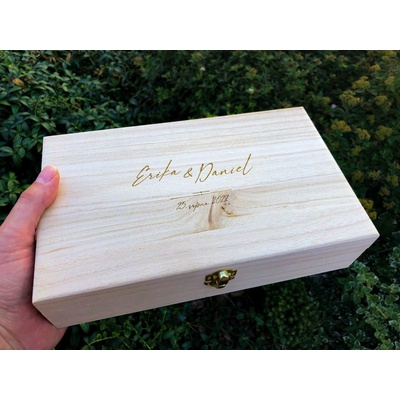 Dřevěná truhla na přání s vlastním textem Dřevěná truhla na uložení blahopřání ke svatbě, pokladů vašich dětí nebo vzpomínek na určitý okamžik s hlubokým laserovým gravírováním vlastního textu, monogramů či celých jmen.Truhla je vyrobena z opracovaného přírodního dřeva...