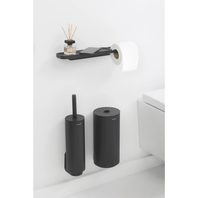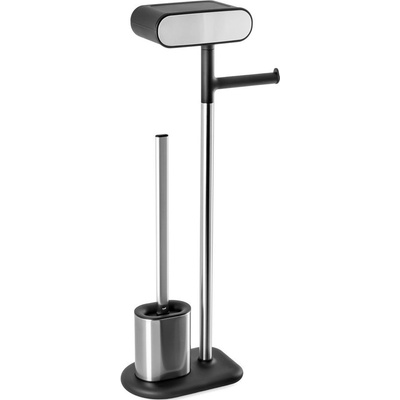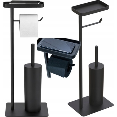 Moderní stojan na toaletní papír s toaletní štětkou a funkční policí. Je vyroben z oceli lakované černě s matným povrchem. Má stabilní obdélníkovou základnu. Nádoba na WC...
