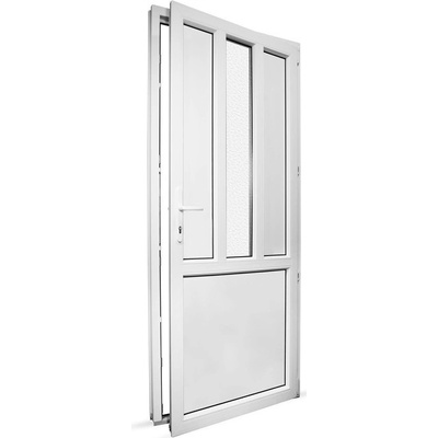Plastové vedlejší vchodové dveře jednokřídlé o rozměru rámu 88x208 cm v bílé barvě z interiéru i z exteriéru mají dělení polí na 4 části. Horní pole jsou dělená 1:1:1. Pole...