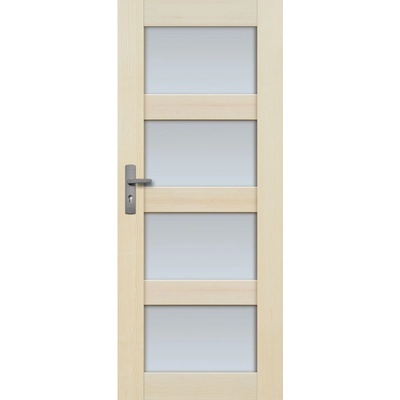 Přírodní borovicové dveře, které prosvětlí a zútulní obývací pokoj díky decentnímu mléčnému zasklení a preciznímu zpracování.