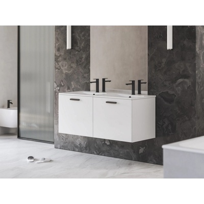 Nábytkové tenkostěnné dvojumyvadlo Chrome Slim z litého mramoru k instalaci na zeď nebo k zapuštění do závěsné skříňky Chrome, s přepadem. Bílé provedení. - rozměr (šxh): 120...