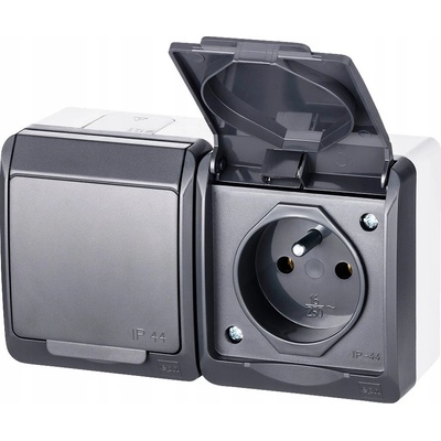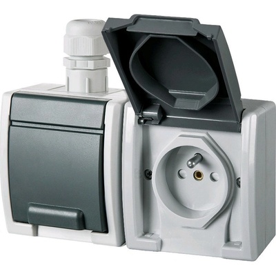 Dvojzásuvka nástěnná EMOS, šedo-černá, IP44 Kvalitní venkovní nástěnná voděodolná FRENCH dvojzásuvka s ochrannými víčky s vyšším krytím IP44. Dvojnásobná zásuvka s ochranným kolíkem a víčkem v šedo-černé barvě je vhodná pro použití v domácnostech, garážích, dílnách,...