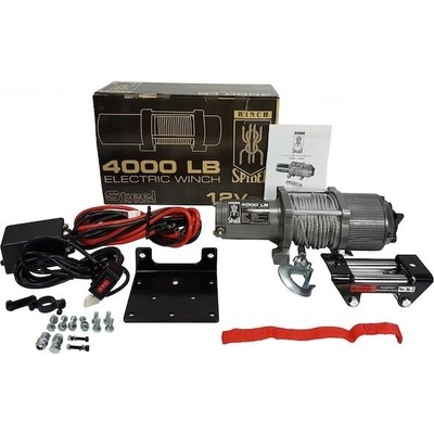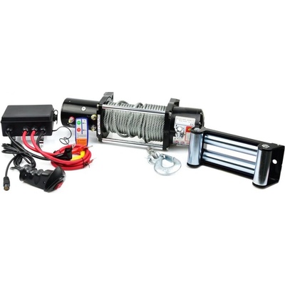 elektrický naviják 12v, max zatížení 907 kg, kabelové dálkové ovládání 2 m, automatická brzda, ocelová konstrukce, lano 4 mm 15 m