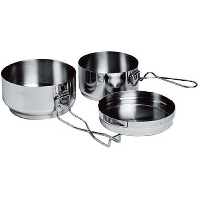 3dílná kempingová sada obsahuje: - 1 x ešus 15,5 x 9cm (objem 0,9l) + víko - 1 x ešus 13,5cm (objem 0,5l)