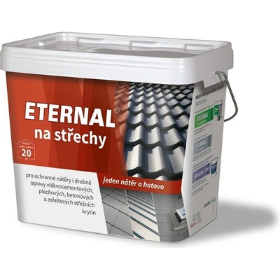 Podrobnosti o produktu 040-192610 10 kg Trvale pružná nátěrová hmota pro ochranné nátěry a renovaci tvrdých střešních krytin (eternit, betonové, neglazované pálené tašky) a asfaltových šindelů na střechách se sklonem minimálně 10 a deg;. ETERNAL na střechy po zaschnutí...