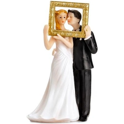 Vtipná sestava, novomanželé držící rám obrazu. Masivní provedení z polyresinu s nejmenšími detaily. Výška 14,5 cm, podstava cca 7 cm.