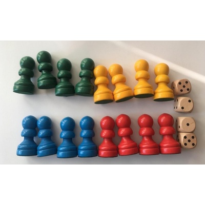 Dřevěné Figurky velké 8 cm na Člověče, nezlob se 4 barvy po 4 kusech plus 4 menší kostky průměr podstavce 4 cm