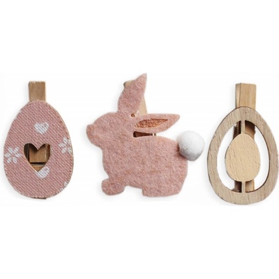 Dřevěný kolíček s filcovou a dřevěnou přízdobou velikonočního zajíčka a kraslic. balení: 3 ks rozměr: 6 cm