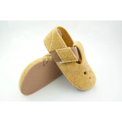 Žluté barefoot bačkůrky, které jsou ušity z teplého a měkkého filcu, který má v oblasti nártu větrací otvory. Podrážka b