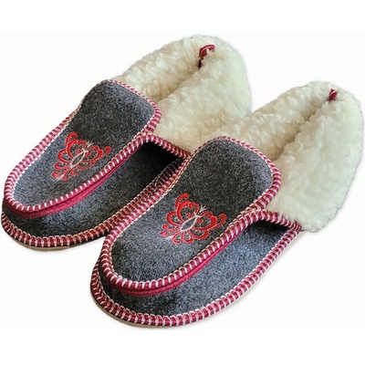Dámské elegantní kotníkové filcové bačkory ručně šité s ovčí vlnou. Vnitřní část bačkor tvoří ovčí vlna a venkovní je ze šedého filce s ozdobným ornamentem na nártu. Bačkory...
