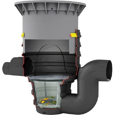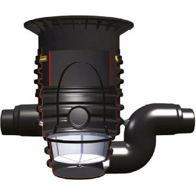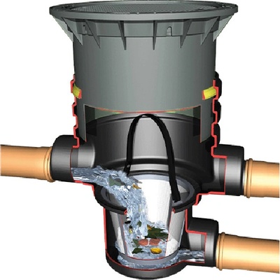 filtrační koš s otvory 0,35 mm nastavitelná hloubka 600 - 1050 mm Možnost připojení DN 110 / DN 160, 1x odtok, 2x přítok vhodné pro odvodňovanou plochu 350 m2 (připojení DN 110) / 500 m2 (připojení DN 160) Poklop pro pochozí použití 100% účinnost filtrace