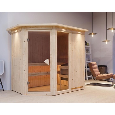 Rodinná sauna je vyráběna přímo ve Finsku a je dodávána tak, abyste si ji mohli doma smontovat i sami. Vchod do sauny je umístěn ve zkoseném rohu. O vyhřátí sauny se starají...