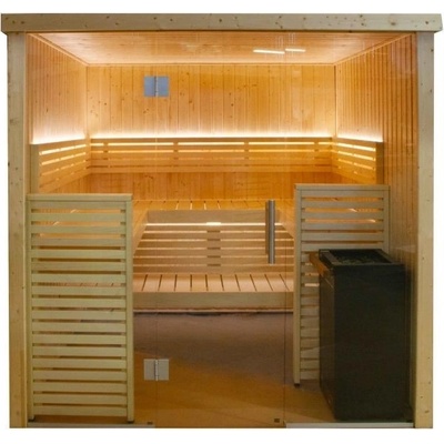 Finská sauna Thermory AS - Finská sauna řady Auroom LUMINA o rozměrech 200x200 cm s celoprosklenou přední stěnou. Sauna je vyrobena z osikového dřeva, které je zpracované pomocí...