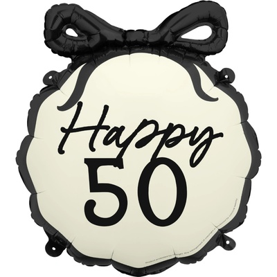 Lze plnit vzduchem i heliem. Fóliový balonek ve smetanové barvě s černou mašlí a nápisem Happy 50 (šťastných 50), velikost 47,5 x 45 cm. Balonek je možné naplnit: heliem -...