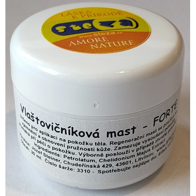 Vlaštovičníková mast - FORTE Obsah: 30 ml. Určeno pro aplikaci na pokožku těla. Regenerační mast se používá na zjemnění a obnovení pružnosti kůže. Zamezuje vysoušení...