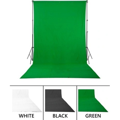 Set tří textilních pozadí ze 100% bavlny. Obsahuje barvy: bílá, černá, chromagreen. Sestava neobsahuje stojany a uchycení.