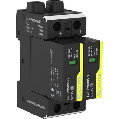 Varistorový svodič přepětí pro DC a FVE Saltek SLP-PV500 V/U v zapojení 'U', typ SPD PV T2. Vyjímatelné moduly, optická signalizace poruchy, možnost blokace modulu.
