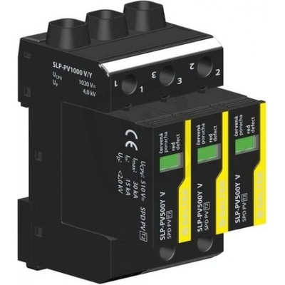 Varistorový svodič přepětí pro FVE Saltek SLP-PV1000 V/Y v zapojení 'Y', typ SPD PV T2. Vyjímatelné moduly, optická signalizace poruchy, možnost blokace modulu.
