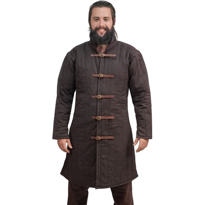 Prošívaný gambeson do půli stehen s dlouhými rukávy hnědý Kolem krku vysoký prošívaný stojáček Vpředu a vzadu je rozparek pro snadný pohyb (po stranách rozparky nejsou) Vpředu...