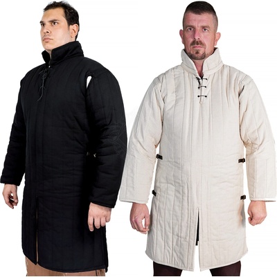 Dlouhá prošívaná zbrojní vesta (gambeson) s bočním zapínáním | Bavlna Naše prošívanice je k dispozici ve dvou klasických variantách – nadčasové černé a přírodní/béžové barvě. Na první pohled zaujme její robustní vzhled, daný silnou vrstvou polstrování a výrazným...