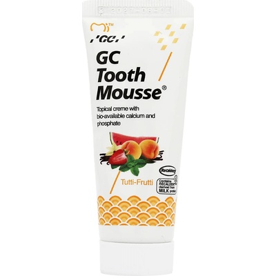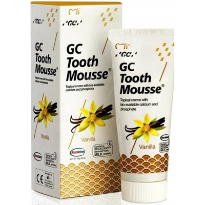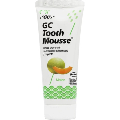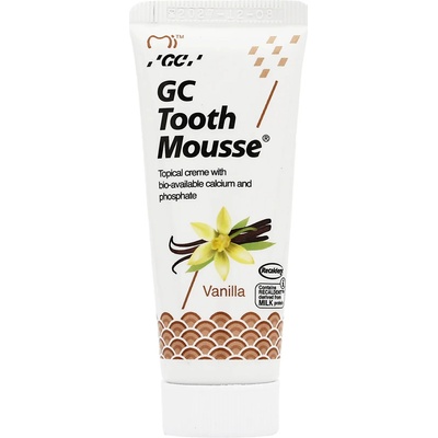 GC TOOTH MOUSSE, bioaktivní dentální ochranný krém bez obsahu cukru a fluoridu, aktivně pomáhá obnovit minerální rovnováhu v ústech, potlačuje deremineralizaci skloviny a snižuje kazivost. Krém obsahuje recaldent - vápník a fosfát, získaný z mléčného kaseinu (CPP-ACP)...