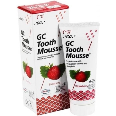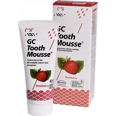 GC Tooth Mousse Jahoda 35 ml Bioaktivní dentální krém (pěna) GC Tooth Mousse s obsahem RECALDENT™ dodává vysokou koncentraci vápníku a fosfátu na potřebná místa, a aktivně tak pomáhá obnovit minerální rovnováhu v ústní dutině.