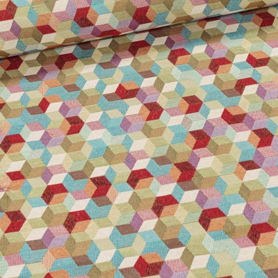 Směsová látka (tkanina) gobelín se vzorem vícebarevných krychliček. Látka je v šířce 140 cm a je vyrobena ze 50% polyesteru a 50% bavlny (310g/m2). Látka je pevná pestře tkaná,...