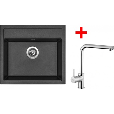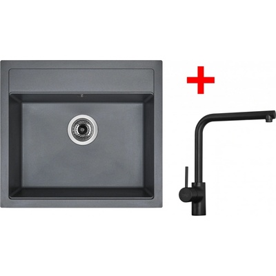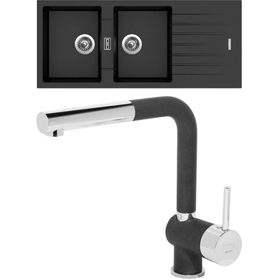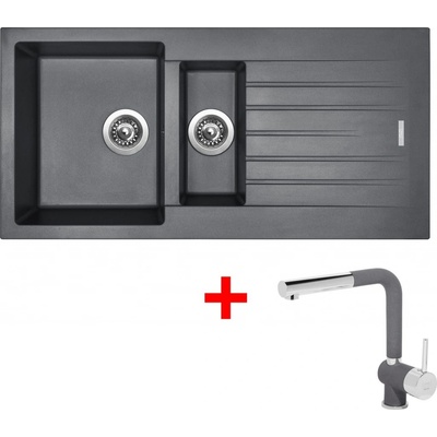 Cenově zvýhodněný set dřezu a baterie Sinks G17174 - obsahuje granitový dvojdřez s odkapem Perfecto 1160 DUO Metalblack 74 a baterii Vitalia Metalblack 74.