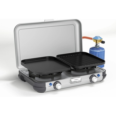 Klíčové vlastnosti: 2 plotýnky Grilovací deska Vysoká stabilita Snadná údržba Snadná manipulace Možnost regulace výkonu Jednoduchý a bezpečný systém výměny kartuší Ideální společník ve vaření k vodě nebo na výlet s rodinou.