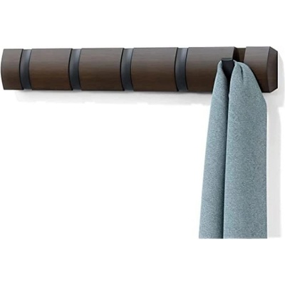 Věšák stěnu FLIP s 5 háčky v barvě hnědočerné a elegantním designu. Rozměry: 51x7x3 cm Materiál: dřevo, kov Barva: hnědá, černá
