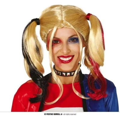 Guirca Paruka Harley Quinn černo-červená Guirca Dámská paruka blond s černo-červeným melírem v culících. Vhodný doplněk k dámskému kostýmu na halloweenský karneval nebo tématický večírek. Material: syntetické vlasy. Univerzální velikost.Rozměry:Délka vlasů: cca 48...