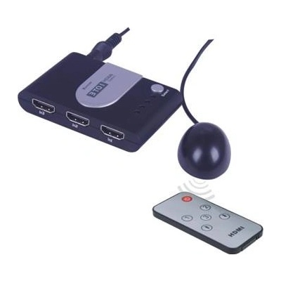 Switch HDMI verze 1.3, rozlišení až 1080p, 3x vstup a 1x výstup, přepínání tlačítkem, dálkovým ovládáním nebo automaticky.