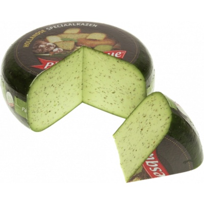 Složení: Pasterizované kravské mléko, sůl, 0,8 % zelené pesto (bazalka, česnekový prášek), zákysové kultury, mikrobiální syřidlo, barvivo (E141), konzervant (E251, E1105...