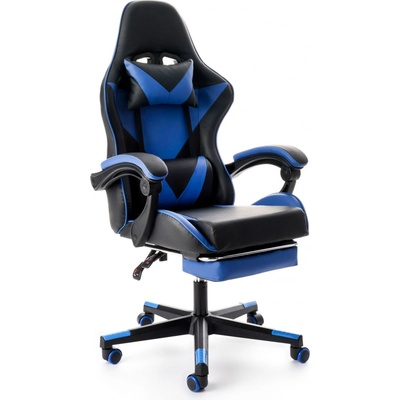 Herní židle z prodyšné a odolné tkaniny má stabilní konstrukci, polohování zad, ergonomické sedadlo, protiskluzové područky, bederní i krční polštář a výklopnou opěrku nohou.