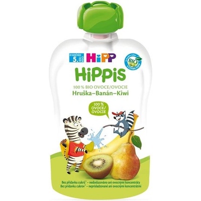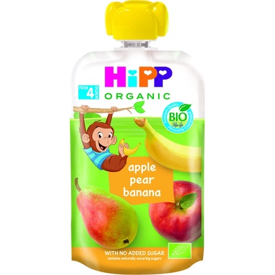 HiPP BIO 100% ovoce Jablko – Hruška – Banán 100 g, od ukončeného 4. měsíce Víte, jak plníme naše kapsičky ovocem? Přeci za pomoci HiPPis zvířátek. Opička Žofka podává ovoce z...