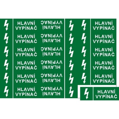 Bezpečnostní tabulka se symbolem blesku a nápisem HLAVNÍ VYPÍNAČ.Materiál: samolepící fólieRozměry: 74 x 26 mm1 samolepící tabulka obsahuje 8x symbol Hlavní vypínač